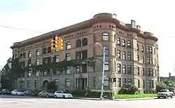 The Coronado is a four-story Romanesque apartment building built on a high basement.[2] It is constructed of yellow brick and rusticated sandstone with a flat roof and architecturally designed elevations on both the Second and Selden avenues sides. The Second Avenue façade is primarily symmetrical, with three entrances and open loggias on the floors above each. The façade is terminated at the south end by a curved bay window and at the north (Selden) corner by a round turret.[2] The building is divided horizontally, with rusticated sandstone forming the outer walls up through the second story, and yellow brick above. A broad cornice and wide panelled brick frieze, pierced with ventilation holes, tops the building.[2]