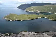 Coronation Island is located in Alaska off the northwest coast of Prince of Wales Island, south of Kuiu Island, and west of Warren Island. High prevailing winds and waves from the open ocean to the west, combined with a steep, rocky coast, result in virtually unaccessible shore due to heavy surf along the windward (western and southwestern) coastline of the island. The few protected coves and beaches along the leeward (eastern and northeastern) shore are guarded by rocky shoals. Thus, the island is difficult to access by any route, and is generally limited to small boat or floatplane during brief lulls in the weather. There are no developed facilities and no groomed trails on the island. Wilderness camping is unrestricted and fishing and hunting are allowed.[1] The nearest full-service community is Craig, Alaska. The island is also home to the Coronation Island Wilderness, which encompasses 19,232 acres (78 km2) and includes the adjacent Spanish Islands.[2] There are several sea caves on the island, and some of these contain fossils.[3]