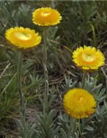 Coronidium monticola, commonly known as the mountain coronidium,[2] is a flowering plant in the family Asteraceae and grows in open forests in eastern Australia. It has woolly, grey-green leaves and mostly yellow flowers.