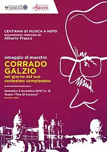 Corrado Galzio, (Italian pronunciation: [korˈraːdo ˈgaltsjo]; Noto, November 3, 1919 – Noto, April 19, 2020) was a noted musician and piano player who founded the International Music Festival of Noto and the Italian Music Conservatory in Caracas. He promoted the popularization of musical culture as well as initiating the interchanges between Italy and Venezuela. In Venezuela, he carried out an intense career as an artist, teacher, and director of successful radio and television programmes. He is widely recognised as the father of chamber music culture in the Latin American country.[1][2][3]