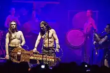Corvus Corax is a German band known for playing neo-Medieval music using authentic instruments. Their name is the Latin name for the common raven. The band was formed in 1989 by Castus Rabensang, Wim (Venustus) and Meister Selbfried ("Master Selfpeace") in East Germany. The band often uses bagpipes as the solo instrument; their live performances attract attention with the bizarre look of the musicians being reminiscent of ancient Greek myths: half-naked, dressed in unusual clothes, wearing primitive tribal decorations, often tattooed.