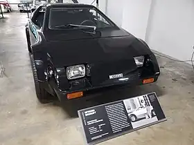The car's bodywork is made of fiberglass. The original body shape had round headlamps that protruded above the hood line and were blended in by wedge-shaped covers that tapered back into the hood. These were later replaced by rectangular headlamps and a smooth hood line. No side windows were fitted to the prototype.