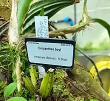 Coryanthes boyi, also known by the common name Boy's Coryanthese,[1] is a species of epiphytic bucket orchid boasting green flowers dotted with tight purple-brown blotches. It is native to Venezuela and northern Brazil growing at an elevations of 1000 to 1500 meters.[1][2] No subspecies are listed in the Catalogue of Life.