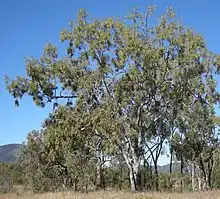 Corymbia dallachiana commonly known as Dallachy's ghost gum[2] or Dallachy's gum,[3] is a species of tree that is endemic to Queensland. It has smooth bark, lance-shaped or curved adult leaves, flower buds usually in groups of three, white flowers and cup-shaped, cylindrical or barrel-shaped fruit.