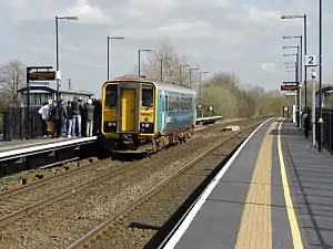 ![]() An Arriva Trains Wales train pauses to collect passengers on a Sunday service at Cosford | |