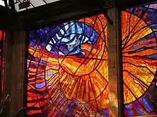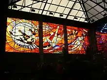 The main focus of the work is a panel with a fiery sun bearing the image of a man, who represents mankind. The image represents mankind in perfect harmony with the forces of creation, virtue, art, science, truth, beauty, wisdom and other qualities.[8] This panel is known as the Hombre Sol or Sun Man. Each year on the spring equinox, the sun aligns with the Hombre Sol. This annual event last about twenty minutes in the late afternoon and is celebrated with a classical music concert, timed to the passing of the sun. When the rays of the sun pass through the stained glass work, the image of the sun shines brighter, as if it is on fire.[9] Sometimes the equinox show is hosted by Leopoldo Flores himself, which he last did in 2004. The Hombre Sol has become the symbol of Toluca and the State of Mexico.[5]