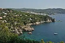 The coast was named Costa Brava by Ferran Agulló i Vidal in an article published in the Catalan newspaper La Veu de Catalunya in September 1908. Agulló, a journalist born in Girona, referred to the rugged landscape of the Mediterranean coast which runs from the River Tordera, near Blanes, to Banyuls with the name Costa Brava.[1][2] Costa is the Catalan and Spanish word for 'coast', while Brava in both languages means 'rugged' or 'wild'.[3] This term was officially recognized and promoted in the 1960s as it was deemed suitable to promote tourism in the region.[4] Before Costa Brava became the official name, other names were suggested, such as Costa Grega (Greek Coast), Costa del Corall (Coral Coast), Costa Serena (Serene Coast), Costes de Llevant (Levant Coasts) or Marina de l'Empordà (Empordà Marine).[5]