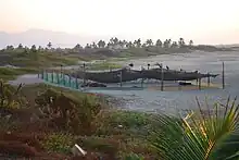 Most of the beaches of the Costa Grande are considered to be "semi-virgin," meaning there is no or relatively little development. Many do not have hotels but rather offer camping or simple bungalows, with restaurants in the open air under ramadas.[3][4] While the hunting of sea turtles and the consumption of their eggs was legal in Mexico until recently, they are now not only banned, but many beaches along the Costa Grande have "campamentos tortugeros," or turtle breeding stations. These are areas where turtle eggs are collected after a female deposits them, then taken to a place where they are incubated safe from predators and humans, as there is still a black market for turtle eggs. Some of these stations are located in the Isla de los Pájaros and Playa Michigan, and Piedra de Tlacoyunque. Most are locally run either voluntarily or with government support. When the baby turtles hatch, volunteers release them into the nearby ocean and in many places, local schoolchildren and tourists are encouraged in participate in the release of turtles and sometimes in the collection of turtle eggs. In Tenexpa area alone, 150,000 baby turtles were released into the ocean in one year.[8]