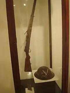 Rifle and helmet used during the Costa Rican civil war of 1948. Temporary exhibition in the National Museum of Costa Rica.
