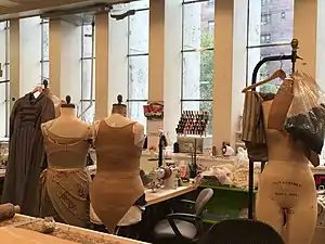 A costume shop is where the costumes worn on stage for a production are built. Some costume shops have washers for cleaning costumes, fitting rooms, racks for storage or spaces for designers to conceptualize a costume. Some shops allow rentals of their costumes.[1] However, the most common and primary purpose for a costume shop is for building and finishing pieces that go onstage.[2]