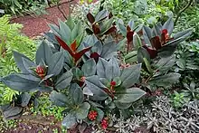 Costus erythrophyllus is a tropical rhizomatous perennial native to Colombia, Ecuador, Peru, and northern Brazil, which was first described in 1929. The most common form in cultivation grows to about 1 meter in height, with waxy leaves that are dark green on top, and deep purple underneath.