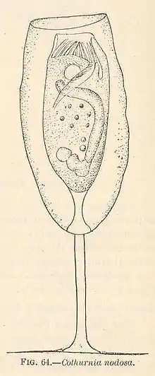 Cothurnia and other peritrichs were among the first microbes observed by Antoine van Leeuwenhoek upon the invention of his microscope in the 17th century. His observation of Cothurnia, Coleps and Vorticella under the microscope led to the publication of their illustrations in 1702.[8] The name Cothurnia was coined two centuries later by Christian Gottfried Ehrenberg to distinguish loricate peritrichs with stalks (Cothurnia) from those without stalks (Vaginicola). Further studies of the genus led to the establishment of Cothurnia imberbis as the type species in 1831.[9] Ehrenberg illustrated C.imberbis Ehrenberg in his 1838 book called Die Infusionsthierchen als Vollkommene Organismen.[10] However, Jankowski noted that C.imberbis was not desirable to be a type species because it was understudied and difficult to do so; apparently unaware of Bacon's extensive study of it. In Ehrenberg's 1839 publication with Louis Mandl entitled Traité pratique du microscope et de son emploi dans l'étude des corps organisés, they provided the definite description of Cothurnia.[11]