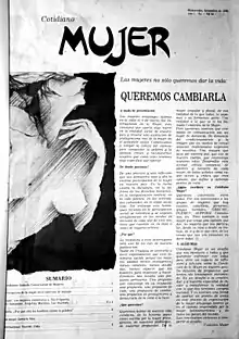 The legalization of abortion in Uruguay was one of the main objectives of the organization and of the magazine, which began a campaign to this end in 1989.[5][6] Another important focus of the magazine was questioning the image of women in traditional media. In this area, in 1997, with the support of UNICEF, a media monitoring program was carried out that produced more than 25,000 record cards on issues related to women and children.[7]