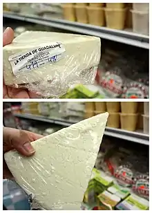 Cotija is an aged Mexican cheese made from cow's milk and named after the town of Cotija, Michoacán.[1] White in color and firm in texture, its flavor is salty and milky. "Young" (or fresher) cotija cheese has been described as akin to a mild feta, while aged (añejo) cotija is more comparable in flavor to hard, aged cheeses like Parmesan. Cotija softens when exposed to heat, but does not melt.[2] Made between the summer and fall seasons; this cheese is made with milk from local cattle and is salted before the fermentation process. The manufacturing processes of most cheeses in Mexico are still rustic and traditional, similar to the manufacturing process that was used upon its invention. Due to the traditional means of production of dairy products in Mexico some dairy products have a conflicting shelf-life which leads to earlier expiration. However, some studies suggest components in the fermentation of Cotija Cheese are natural preservatives that can extend the shelf-life of Cotija Cheese and other food products as well.[3]