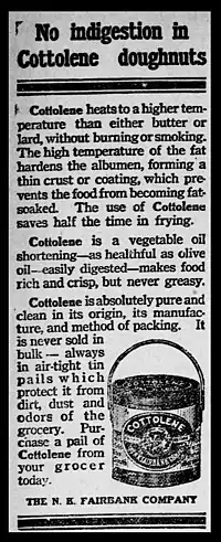 It was cottonseed's depressed value that led a newly formed Procter & Gamble to utilize its oil.[42] The Panic of 1837 caused the two brothers-in-law to merge their candlestick and soap manufacturing businesses in an effort to minimize costs and weather the bear market.[41] Looking for a replacement for expensive animal fats in production, the brothers finally settled on cottonseed oil. Procter & Gamble cornered the cottonseed oil market to circumvent the meat packer's monopoly on the price. But as electricity emerged, the demand for candles decreased.[42] Procter and Gamble then found an edible use for cottonseed oil. Through patented technology, the brothers were able to hydrogenate cottonseed oil and develop a substance that closely resembled lard.[41] In 1911, Procter & Gamble launched an aggressive marketing campaign to publicize its new product, Crisco, a vegetable shortening that could be used in place of lard.[44] Crisco placed ads in major newspapers advertising that the product was "easier on digestion ... a healthier alternative to cooking with animal fats ... and more economical than butter."[45] The company also gave away free cookbooks, with every recipe calling for Crisco. By the 1920s the company developed cookbooks for specific ethnicities in their native tongues.[45] Additionally, Crisco started airing radio cooking programs. Similarly, in 1899 David Wesson, a food chemist, developed deodorized cottonseed oil, Wesson cooking oil.[42] Wesson Oil also was marketed heavily and became quite popular too.