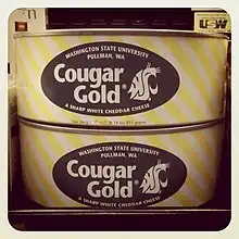 Cougar Gold is an American Cheddar cheese produced at Ferdinand's Creamery on the Washington State University campus in Pullman, Washington. Like other cheeses sold at the creamery, Cougar Gold is notable for being sold exclusively in 30 oz (850 g) tin cans.[1] Cougar Gold is a white, sharp cheddar that is aged at least one year. It has a nutty flavor somewhat resembling Swiss or Gouda. When properly refrigerated, Cougar Gold is claimed to last indefinitely in the can. An unopened can becomes more flavorful, sharp, dry and crumbly with age. Approximately 250,000 cans of Cougar Cheese are produced annually, with around 80% of it being Cougar Gold.[2]