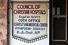 Council of Christian Hospitals[1] (COCH), an autonomous[2] body that facilitates management of medical institutions founded by Missionaries of Canadian Baptist Mission. COCH is a body corporate under Indian Societies Registration Act and has its registered office in premises of one of its participating hospitals, that is, CBM Christian Medical Centre, Pithapuram in East Godavari District of Andhra Pradesh.