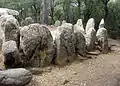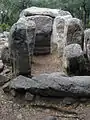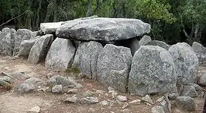 This megalith monument was built out of granite blocks and is dated around 2700–2200 BCE. It was discovered by Pere Cama i Casas and the first mention of its uncovering was by Agustí Casas in 1894. It was later excavated by Lluís Esteva Cruañas, who unearthed human bones and teeth, flint arrowheads, knife and pottery fragments and necklace beads. It was partially reconstructed in the 1950s. It is seven metres long and made up of an entrance passage into the funeral chamber, with a circular tumulus that is 10 metres in diameter.[2] The entrance to the tomb is oriented to the southeast, which allows sunlight to reach the interior on the winter solstice.[3]