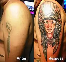 A cover-up is a tattoo done over an unwanted past tattoo, scars (especially those resulting from surgery or self-harm), or symptoms of a skin condition. It is one of the two main options of removing an unwanted tattoo; the other option being laser removal. Covering up an unwanted tattoo is generally cheaper, less painful and an overall easier solution than tattoo removal.[1]: 104 A person may choose to get a cover-up over an older tattoo for aesthetic reasons, such as to enhance or replace a faded tattoo, or to erase an unwanted reminder. Numerous celebrities have employed tattoo artists to cover up existing tattoos, often after the breakup of a relationship. Some tattoo artists volunteer to cover hateful and gang-related tattoos with new designs for free.