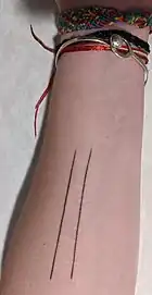 For people with self-harm scars, cover-up tattoos can be a way of moving past trauma.[32][33] One motivation for tattooing an area may be to discourage oneself from self-harming in it again,[34]: 105 although some may nonetheless cut on top of a tattoo.[35]: 176 Some people choose to incorporate self-harm scars into tattoo designs, for instance making them look like scratch marks from a dragon.[34]: 105–107