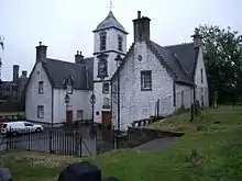 John Cowane's brother, Alexander, acted as his executor and signed the hospital's Deed of Foundation on 13 February 1637.[7] The land, sited adjacent to the Church of the Holy Rude in a prestigious part of the town, was transferred to the Town Council, and plans for the new building were commissioned from the royal master-mason John Mylne. As with Mylne's other architectural work, the design shows contemporary Dutch influences, notably the form of the bell tower and crow-step gables. In a niche on the tower is a statue of John Cowane, sculpted by Mylne and William Ayton.[1] The statue, locally known as "Auld Staneybreeks" (old stone-trousers), is said to come to life and dance in the courtyard at Hogmanay (New Year).[8]