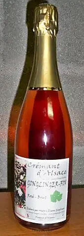 Crémant d'Alsace (French pronunciation: [kʁe.mɑ̃ dal.zas]) is an Appellation d'Origine Contrôlée for sparkling wines made in the Alsace wine region of France. Produced since 1900, the Crémant d'Alsace AOC was recognized in 1976 by the INAO and the designation Crémant regulated by the European Parliament in 1996.[1]