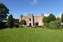 Crabwall Manor (original name Crabwall Hall[1]) is a former country house, later a hotel, in the village of Mollington, Cheshire, England. The present building dates from the 18th century.[2] It replaced an early 17th-century house built for the Gamul family.[1] The house was originally a "modest brick cottage" and it was refaced in the early 19th century. Figueirdo and Treuherz comment that this give it "the appearance of a toy fort".[1] The interior was remodelled in about 1900.[2] It has since been converted into a hotel, with extensions added in 1987.[1] It is constructed in orange and yellow brick with red sandstone dressings. The roof is in Welsh slate and there are three brick chimneys. The building is in two storeys, with an entrance front of three bays. At the corners are octagonal towers. The central bay protrudes and forms a two-storey porch; it is supported by diagonal buttresses. The tops of the porch and towers are crenellated. The building is recorded in the National Heritage List for England as a designated Grade II listed building.[2]
