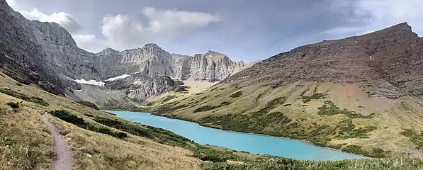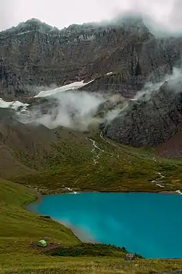 Cracker Lake is located in Glacier National Park, in the U. S. state of Montana. Located at the head of a canyon, the waters of Cracker Lake are an opaque turquoise from rock flour (silt) originating from Siyeh Glacier. To the south of Cracker Lake lies Mount Siyeh which rises more than 4,000 feet (1,200 m) above the lake. Cracker Peak to the southeast and Allen Mountain to the north are other prominent peaks nearby.[2] Cracker Lake is a 6.1-mile (9.8 km) hike from the Many Glacier Hotel.[3]