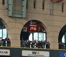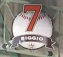 Craig Biggio's retired number 7 at Minute Maid Park. Since the retirement, the number has since been painted to reflect the current Astros color scheme of blue and orange while also adding a Sunshine Kids logo on the side, mimicking his tradition of wearing it on his cap.[30]