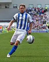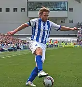 On 4 July 2011, Mackail-Smith joined Brighton & Hove Albion for an initial transfer fee of £2.5 million, possibly rising to £3.25 million, signing a four-year contract.[31] He scored his first goal for Brighton in a 1–0 win away to Portsmouth on 13 August.[32] Mackail-Smith then scored four goals in his next seven matches, including a brace in a 3–3 draw at home to Leeds United.[33] However, Mackail-Smith then hit a goal drought and struggled to score, netting just one goal between October and February in a 1–0 win away to Derby County on 29 November.[33] He ended his goal drought by coming off the bench to score the opening goal in a 2–1 win away to Leeds United, Brighton's first away victory over Leeds in 26 years.[34] On his 28th birthday, Mackail-Smith scored at Falmer Stadium for the first time in five months in a 3–0 win at home to Ipswich Town,[35][36] and scored again the next weekend in a 1–1 draw with Doncaster Rovers.[37] In total, Mackail-Smith scored 10 goals for Brighton, and he revealed his disappointment at his goal haul, which he largely put down to adapting to Brighton's passing style of football.[38]
