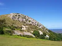 The cliff lies on the west bank of the Afon Dulas, which reaches the sea at Llanddulas, and is slightly inland of the belt of carboniferous limestone that runs along the coast from Great Ormes Head to Point of Ayr, about three miles west of Abergele. The Dulas passes through a gap in the limestone belt, the strata of which dip from the north or northeast. This band of limestone is less than a mile wide. The summit of the hill is 190 m (623 ft) above sea level.[2]