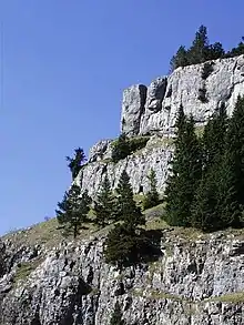 Craig y Forwyn ("Maiden's Crag") is a crag that encloses the northern side of World's End, near the town of Llangollen in Denbighshire, Wales.[1] It is part of the limestone escarpment that separates the Eglwyseg Valley from the higher Ruabon Moors and, along with nearby Craig Arthur, is a popular site for rock climbing. Evidence of lead and silver mining is found just to the west.[2] The Offa's Dyke Path runs along its foot.