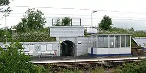 The station is equipped with a shelter (which is accessed by some steps), a bench and bike racks, as well as a car park, accessed over the footbridge. The only step-free access to the station is from Dennistoun Crescent.[8] As there are no facilities to purchase tickets, passengers must buy one in advance, or from the guard on the train.