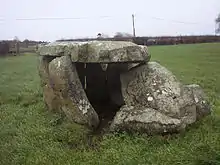 Craigs Dolmen (also known as the Broad Stone) is situated three miles north of Rasharkin, County Antrim, Northern Ireland, close to a minor road, at a height of 200m on the Long Mountain.[1] Craigs Dolmen passage tomb is a State Care Historic Monument in the townland of Craigs, in Borough of Ballymoney, at grid ref: C9740 1729.[2]