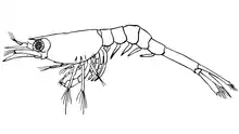 Crangon allmani body length is up to 77 mm. It has a brownish-gray to reddish-gray colour. The short rostrum is about half as long as the eyes and is small with a rounded end.[4] The carapace is smooth except for some small items.[5] Crangon allmani can be distinguished from the North Sea shrimp Crangon crangon by a longitudinal furrow along the back on the sixth and hindmost pleon segment. A ridge occurs along each side of the furrow. Two pairs of small thorns are on the telson.[6]