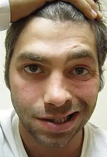 Damage to the facial nerve (VII) may cause facial palsy. This is where a person is unable to move the muscles on one or both sides of their face.[16] The most common cause of this is Bell's palsy, the ultimate cause of which is unknown.[16] Patients with Bell's palsy often have a drooping mouth on the affected side and often have trouble chewing because the buccinator muscle is affected.[3] The facial nerve is also the most commonly affected cranial nerve in blunt trauma.[20]