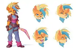 The statement set for the game's tone was summarized as "Jackass meets Looney Tunes", which Toys for Bob studio head Paul Yan defined as "barreling into danger [with the] silliness and wackiness of Looney Tunes" while recognizing the latter source as a primordial influence on the series.[21]:9:43 In order to solidify this tone, the development team set updating Crash's design for the new game as their earliest task, which prompted conversation within the art team attempting to determine Crash's personality. They eventually honed in on what Nadelberg described as "this dude who's always in the wrong place at the wrong time" who "just manages to get himself out of all these crazy situations in a heroic way, but he's not your classic hero". The team's concept artists created various designs for Crash, with Kole being tasked with combining the most suitable elements from each iteration. Kole did not find photographic references to real bandicoots helpful in the design process, as his attempts to incorporate them resulted in a deviation from the character's spirit; Kole likened Crash's general design to an artist's attempt at drawing a bandicoot from memory a couple years after having seen one.[33] Artist Ryan Jones took the liberty of omitting Crash's flesh-colored lips in favor of a simpler two-toned fur treatment, which was incorporated into his final design.[34] Crash's lack of a neck was the most difficult aspect of his design for the development team's modelers to translate; as Kole observed: "He's just shoulders and then a head. It was actually kind of a big technical challenge to pull that off just right."[33] Coco's redesign, meanwhile, required only minor adjustments, aside from updating her laptop to a tablet.[35]
