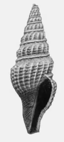 The whorls of the protoconch are probably 3 in the adult; those of the spire 10. The protoconch is smooth, highly polished, and somewhat papillate, the initial whorl for the most part submerged, the succeeding volution rather low and broadly inflated, the final whorl of the protoconch flattened laterally and relatively high. The line of demarcation between the spire and the protoconch is initiated by a protractive thickening of the shell and the introduction of 10 to 12 undulatory protractive riblets on the earlier whorls of the spire, persistent from the appressed posterior margin to the anterior suture. The spiral sculpture first appears near the beginning of the second whorl in the shape of 5 or 6 very faintly impressed sulci. The sculpture is modified with the growth of the shell, so that on the later whorls of the adult the axials increase to as many as 25 and are very sharply pinched, equal and regular in size and spacing, even near the aperture and persistent with uniform strength from the anterior margin of the fasciole to the anterior suture and on the body whorl almost to the base of the columella. They are separated by slightly concave intercostals of more than double their width. The anal fasciole is smoothly concave, more than one-third the width of the whorl in the adult, margined posteriorly by a well-defined sutural cord lirated with 2 or 3 low threads but devoid of any axial ribbing or undulations. The primary spirals in front of the periphery are low, broad, equal, and regular in size and spacing both upon the costal and intercostal areas numbering 4 to 6 on the later whorls of the spire, and separated by shallow channels in which two or three microscopically fine secondaries are usually intercalated. The suture lines are inconspicuous and minutely undulated by the costals of the preceding volution. The aperture is narrowly clavate; the constriction at the base of the body feeble. The outer lip is thin and sharp and expands incrementally. The notch at the posterior fasciole is broadly and symmetrically U-shaped and not very deep. The anterior canal is long for the genus, broad, and very feebly recurved. The anterior fasciole is well defined, closely lirate, incrementally striate, and broadly emarginate at its extremity.[1]