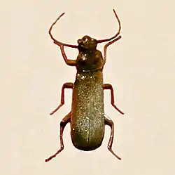 Cratosilis laeta can reach a length of 6–7 millimetres (0.24–0.28 in). These small insects have a black head and a reddish pronotum, while elytrae are brownish with black bands.[3]