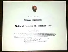 The Craver Farmstead is listed on the National Register of Historic Places as certified by the U.S. Department of the Interior.[2]