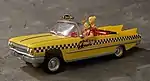In addition to the video arcade games, Sega Enterprises, Inc. (USA) created a Crazy Taxi themed redemption game which was released in 2003.[72] The player had to roll their coin or token down the sloped playing surface past a moving taxi model in the center of the playing field to hit one of eight targets (representing passengers) at the far end. Passengers were worth different points, from which the operator would then set the number of tickets to be won. The game incorporated music and sounds from the video games.[73]