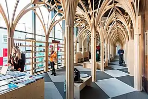On the first floor, London-based architects Studio Ben Allen installed The Clearing as part of the 2017 Triennial. Comprising 16 vertical gothic wooden tree-like forms, creating a cathedral-like visitor centre for the café bar, it is now a permanent part of the Creative Folkestone Artworks collection.[5]