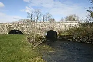 The Cregg River once powered three watermills, of which the converted Cregg Mill is the remaining example. The three mills stood together around the Cregg Mill bridge. The bridge there consists of seventeen arches, but only one arch is currently used. The nineteenth century Ordnance Survey Ireland maps show that the river was much wider at that point.[3] However, due to artificial changes to the water level of Lough Corrib and the canalisation of the river, the river is now much narrower.