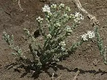 Cressa cretica is a densely branching subshrub growing to a height of about 38 cm (15 in). The leaves are small, stubby, obtuse and clad in silky hairs. The flowers grow in groups in the axils of the upper leaves and are white; the back of the reflexed corolla lobes are hairy near the tip. The fruits are ovoid, pointed capsules, usually containing a single seed.[2]