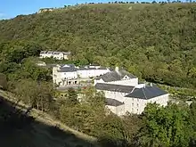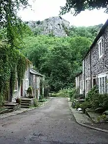 The large lead mining area at Tansley Dale, towards the head of the valley, is a protected Scheduled Monument. The visible remains are ruined stone walls and earthworks.[9] Further south in Cressbrook Dale around the settlement of Ravensdale there is extensive evidence of lead mining in the crags on the western side of the dale all the way from the lead rakes above Tansley Dale to Cressbrook itself. This probably dates from the 1500s up until the purchase of Cressbrook Mill and associated lands, including the dale, by Messrs Phillips and Co in 1814. Ravensdale Cottages (known locally as 'The Wick') in the middle of the valley are two terraces of cottages built by William Newton to house the workers at Cressbrook Mill. They date from 1823 and are Grade II listed buildings.[10][11]