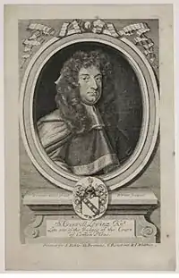 He at once returned to the bar, and was soon busily engaged in pleading. He was one of the counsel for the Seven Bishops in 1688, defended Major John Bernardi (an alleged conspirator in the Jacobite Assassination Plot), securing the dismissal of the bill of indictment by the grand jury and, in the great habeas corpus case of Rex v. Kendall and Roe, before Lord Chief Justice Holt in 1695, he argued successfully against the legality of a committal to prison under a general warrant by a secretary of state. He died at Serjeants' Inn on 29 Jan. 1700–1, and was buried in Evenley parish church.[1] Part of his monument there survives: a more than life-size marble statue of Levinz wearing his judge's robes and wig.[2] He was succeeded by his son William who was a Nottinghamshire MP.