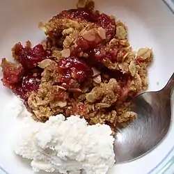 A crisp is a type of American dessert, usually consisting of a type of fruit, baked with a crispy topping,[1] hence the name. The topping usually consists of butter, flour, oats, brown sugar and usually spices such as cinnamon and/or nutmeg. The most familiar type of crisp is apple crisp, where apples are baked with this topping. However, many other kinds of fruit can be used, such as cherries, pears, peaches, blueberries, etc.