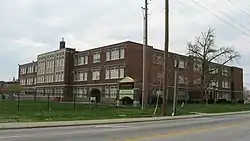 The school covers a two-square-block area and was built in three phases: a three-story, flat-roofed main building with an E-shaped plan on the east, constructed in 1927; a three-story addition to the west of the main building and a two-story gymnasium, built in 1938; and a newer, two-story gymnasium constructed in 1966. The main building, designed by local architects Merritt Harrison and Llewellyn A. Turnock, as well as the 1938 addition, reflect Collegiate Gothic (or Tudor Revival) and Classical Revival styles of architecture. The main building is constructed primarily of red brick and includes buff-colored glazed architectural terra-cotta detailing. The red brick addition built in 1938 has similar architectural detailing but uses limestone instead of terra-cotta. The newer red brick gymnasium built in 1966 has concrete vertical and horizontal bands.[5]