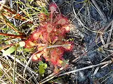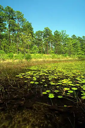 The Croatan National Forest lies completely within the Middle Atlantic coastal forests ecoregion.[8] It is home to a huge variety of marine and terrestrial animals. Some of the wildlife that can be found include black bear, raccoon, squirrel, bobcat, river otter, muskrat, mink, a wide variety of reptiles and amphibians, as well as osprey, peregrine falcon, various species of owls, quail, bald eagle, wild turkey, and alligator. The forest is abundant with pine trees including virgin longleaf pine stands that remain untouched to this date. There are many hardwood areas including the cypress trees of the swamps. Carnivorous plants such as Venus flytraps, sundew, and pitcher plants may also be found. There are a few sandy areas within the forest that provide pristine habitat for the eastern diamondback rattlesnakes. The tannic-stained blackwater present throughout the forest also gives habitat to several unique species of fish who thrive in the forest's unique riverine conditions. Species such as bluespotted sunfish, mud sunfish, banded sunfish, eastern mudminnow, flier, warmouth, redfin pickerel, bowfin and yellow bullhead, among many others, are some of the most commonly encountered fish. The elusive swampfish, a species of cavefish, can also be found in several creeks and canals throughout the forest.