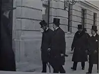 An extraordinary session of the Croatian Parliament, which was convened to read a loyalty oath to the Empire and statement of condolence, was interrupted with accusations and recriminations against ruling Croatian-Serbian coalition by the members of Party of Rights (HSP). The HSP politician Ivo Frank allegedly threatened the Serb representatives with a revolver.[17] On 26 July, partial mobilization was announced. The next day, ban Iván Skerlecz issued a special regulation abrogating Ivan Mažuranić's 1875 Law on Freedom of Assembly. After war was declared on 28 July, many pro-war demonstrations were held in Zagreb. The arrival of recruits to the Zagreb barracks was welcomed with approval. People shouted to the soldiers: "Long live the Croatian army", to which the soldiers would respond: "Long live Croatia, long live the Croatian King [Franz Joseph]".[18]